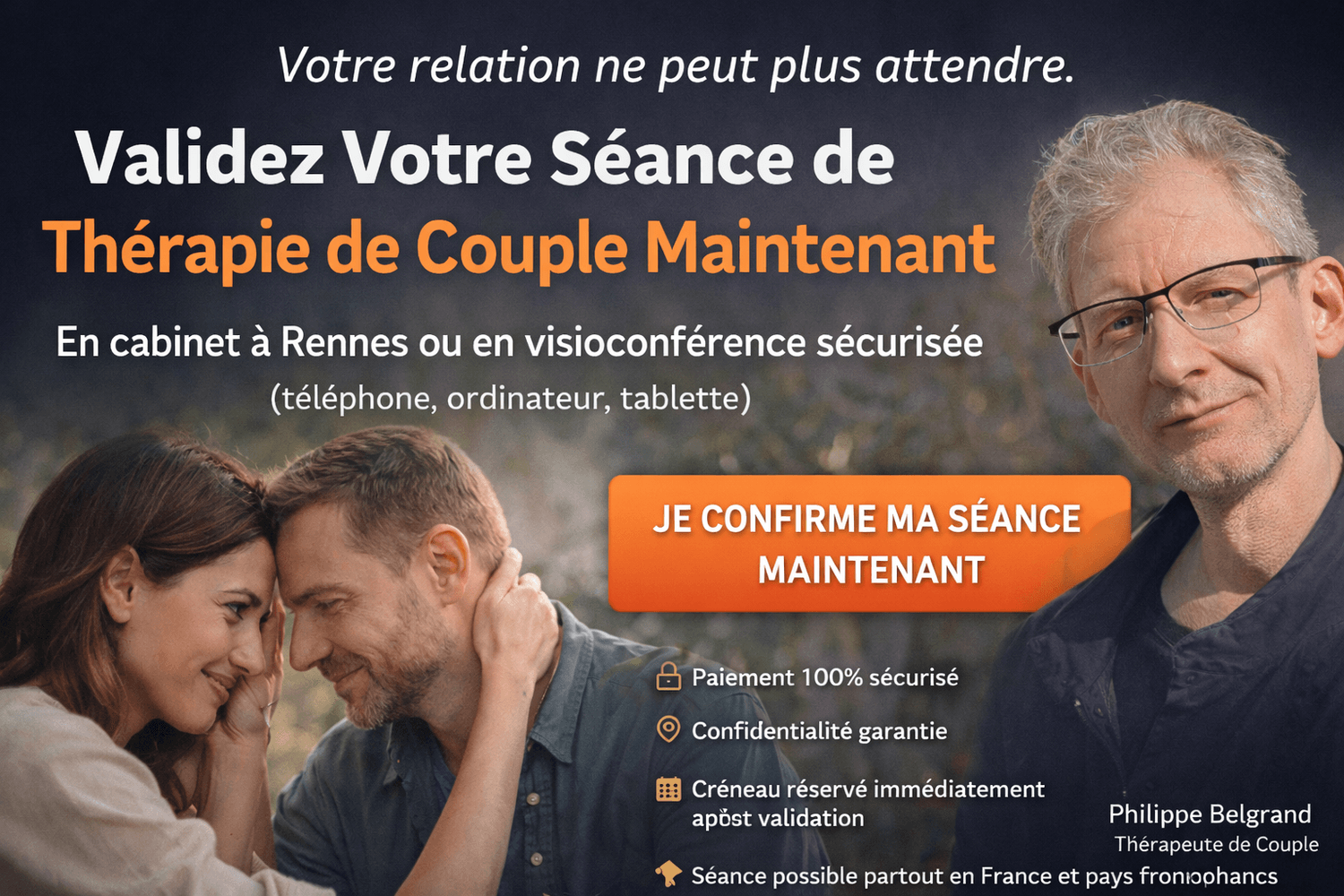 Je suis Philippe Belgrand, thérapeute de couple à Rennes, profondément engagé à vous accompagner avec écoute, empathie et efficacité dans votre chemin vers l’harmonie relationnelle. Que vous soyez du centre-ville de Rennes, de Cesson-Sévigné, Bruz, Pacé ou d’une autre grande ville, je suis là pour écouter votre histoire, apaiser vos souffrances et reconstruire votre lien de couple.
